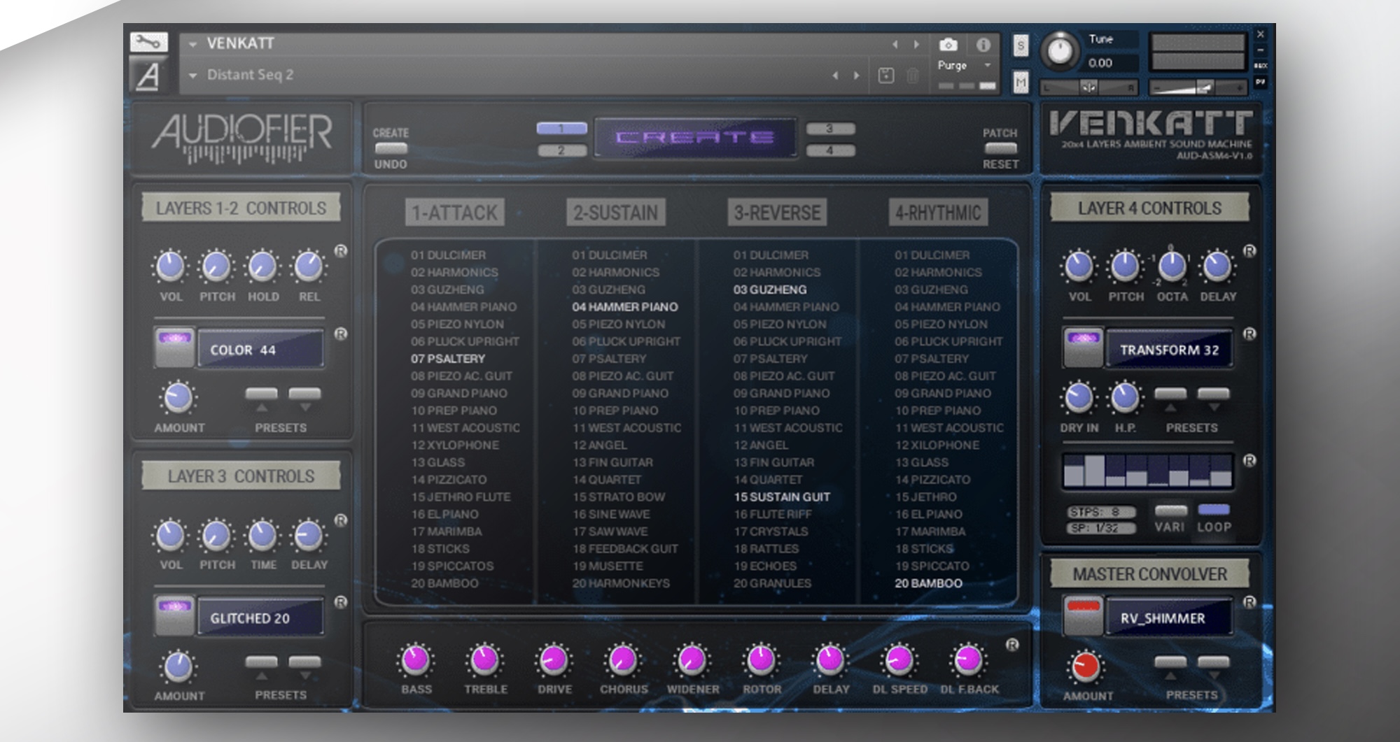 At its core are four sound layers โ Attack, Sustain, Reverse, and Rhythmic โ each packed with rich, characterful sources that can be blended to form entirely new instruments and textures. With over 200 presets, deep randomization, and advanced sequencing tools, VenKatt makes complex ambient sound design fast and inspiring.